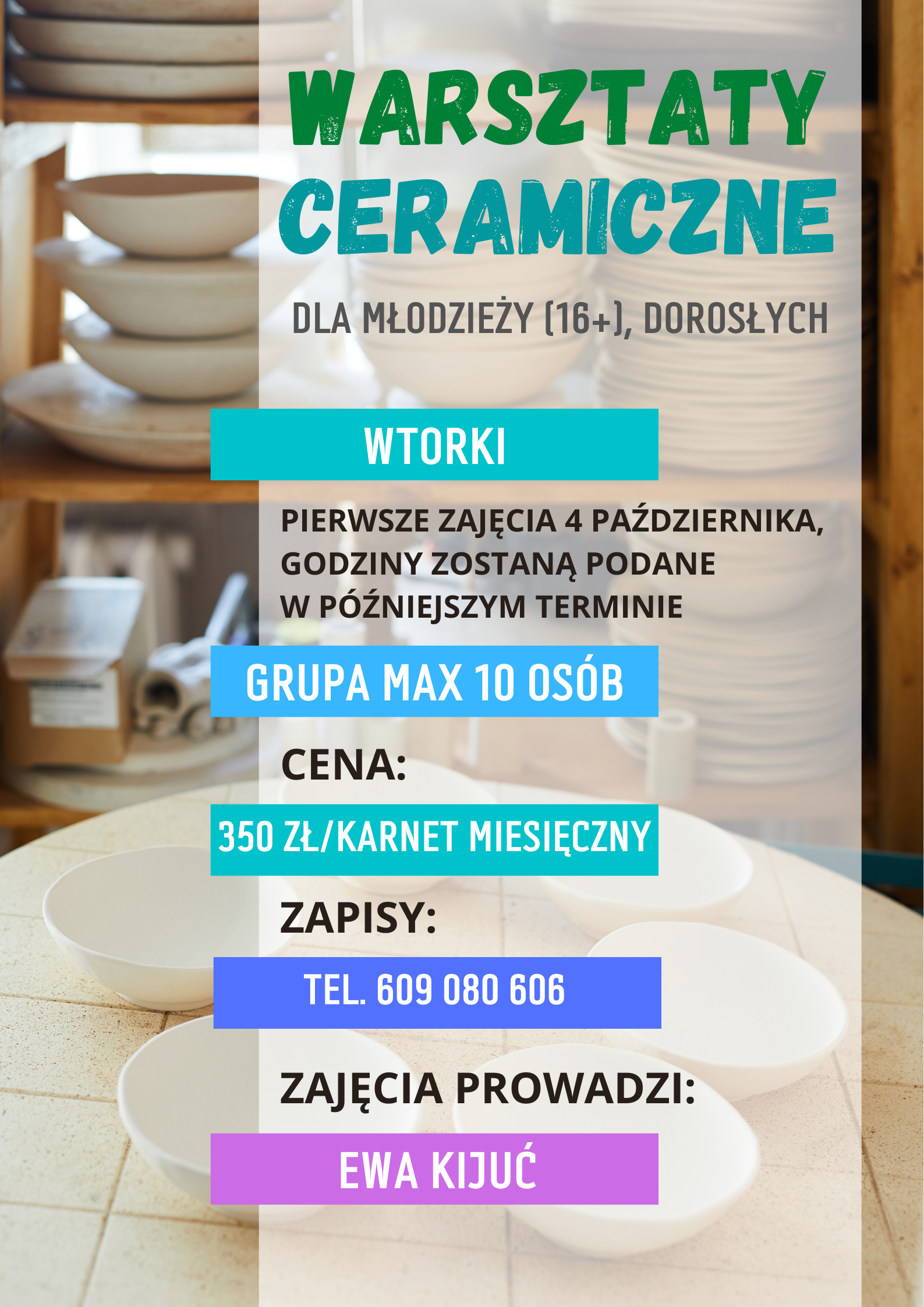 - Warsztaty ceramiczne: szczegóły | Oferta zajęć | Kontakt: os. Wichrowe Wzgórze 124, tel. 61 630 33 17